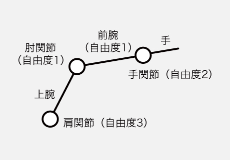 人間の腕の運動関節軸には、左図のように片腕合計 7つの自由度があります。そのうち、「腕の位置と姿勢を決めるためには6つの自由度が決まればよい」という人間工学に基づいた考え方により、本製品の設計を行っています。 本製品では、仰向けになってバーをつかむだけで腕の自由度が決まるため、拘束感なく安定して腕挙上姿勢を保持することができます。