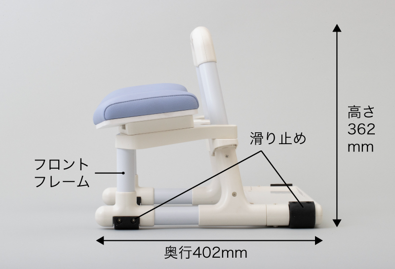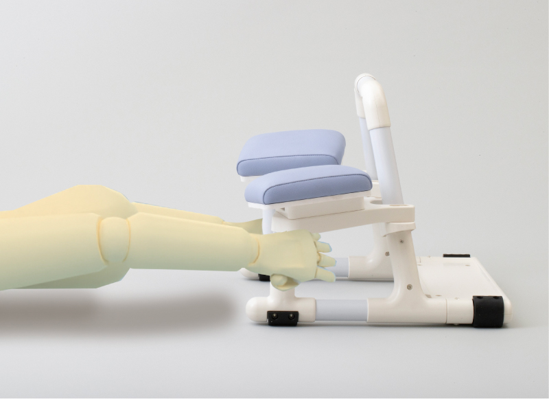 腕置台を頭から離して、肘を伸ばした状態で、フロントフレームをつかみます。手首をフレームに引っかけるなど、しっかりつかまなくても、姿勢が保持できていれば問題ありません。