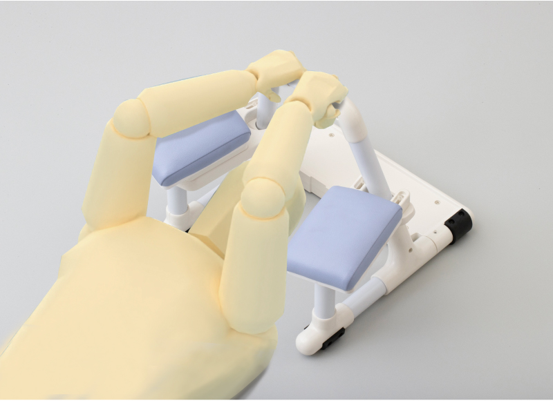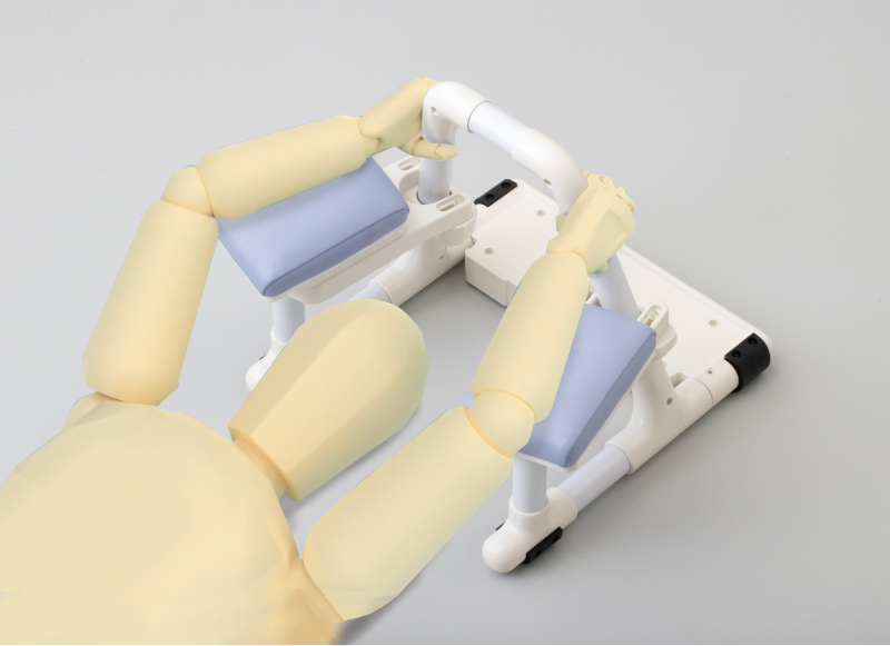 北海道立総合研究機構の協力を受け、人間工学に基づき握りやすく肘が開きにくいデザインを開発しました。腕の自由度を自然に制約し、拘束感なく姿勢が保持できます。