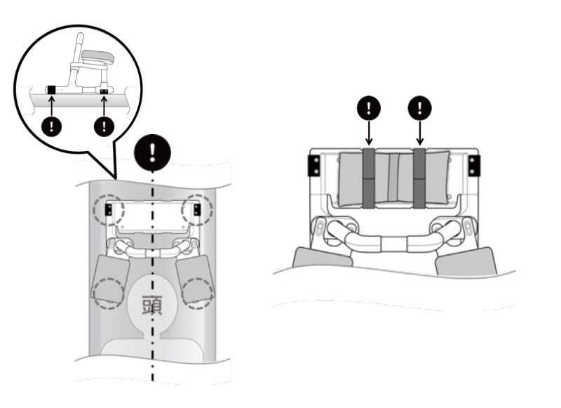 - 設置後、4箇所の滑り止めが寝台にきちんと接しているかを確認してください。4点すべてが接していないと使用時にぐらつくおそれがあります。